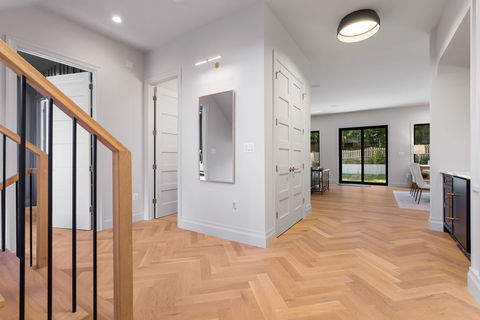 From the moment you step onto the hand-laid travertine porch and through the eight-foot solid wood door, this residence sets the tone: bold, refined, and unapologetically luxurious. Inside, herringbone white oak floors lead past sculptural continuous handrails while natural light pours through oversized Pella windows.